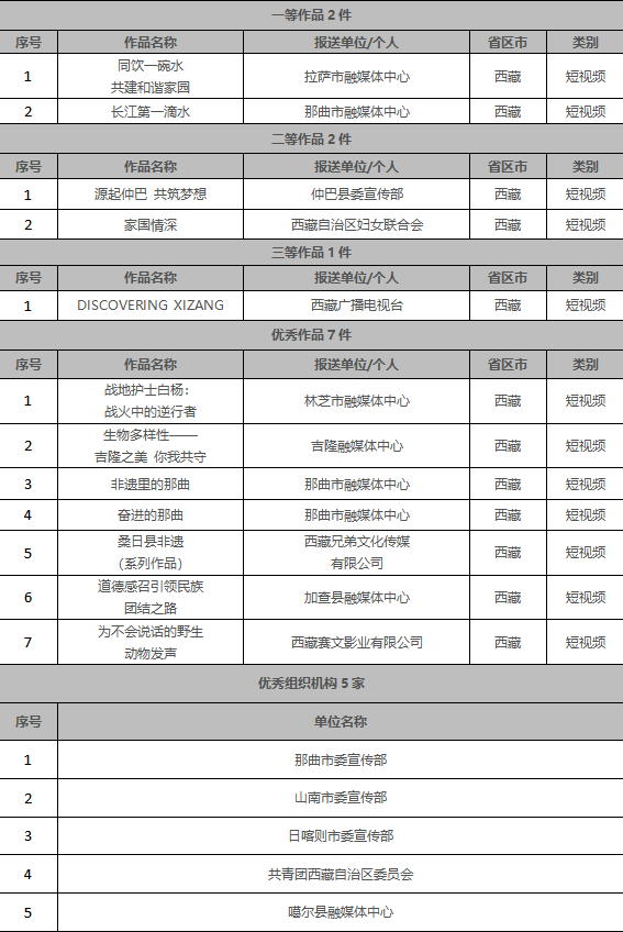 西藏自治区广播电视局推送作品116部,12部作品、5个机构获奖,其中获一等作品2部、二等作品2部、三等作品1部、优秀作品7部,那曲市委宣传部、山南市委宣传部、日喀则市委宣传部、共青团西藏自治区委员会、噶尔县融媒体中心获优秀组织机构。