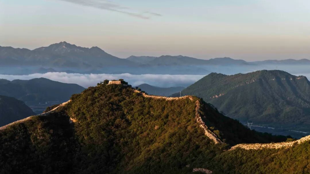 北京市平谷区金海湖镇的红石门长城在雨后晨光的映衬下宏伟壮观(无人机照片)。新华社发(刘满仓 摄)