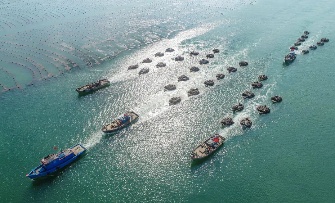 荣成市海带养殖区,村民将收获的海带运往码头(无人机拍摄)。新华社发(李信君 摄)