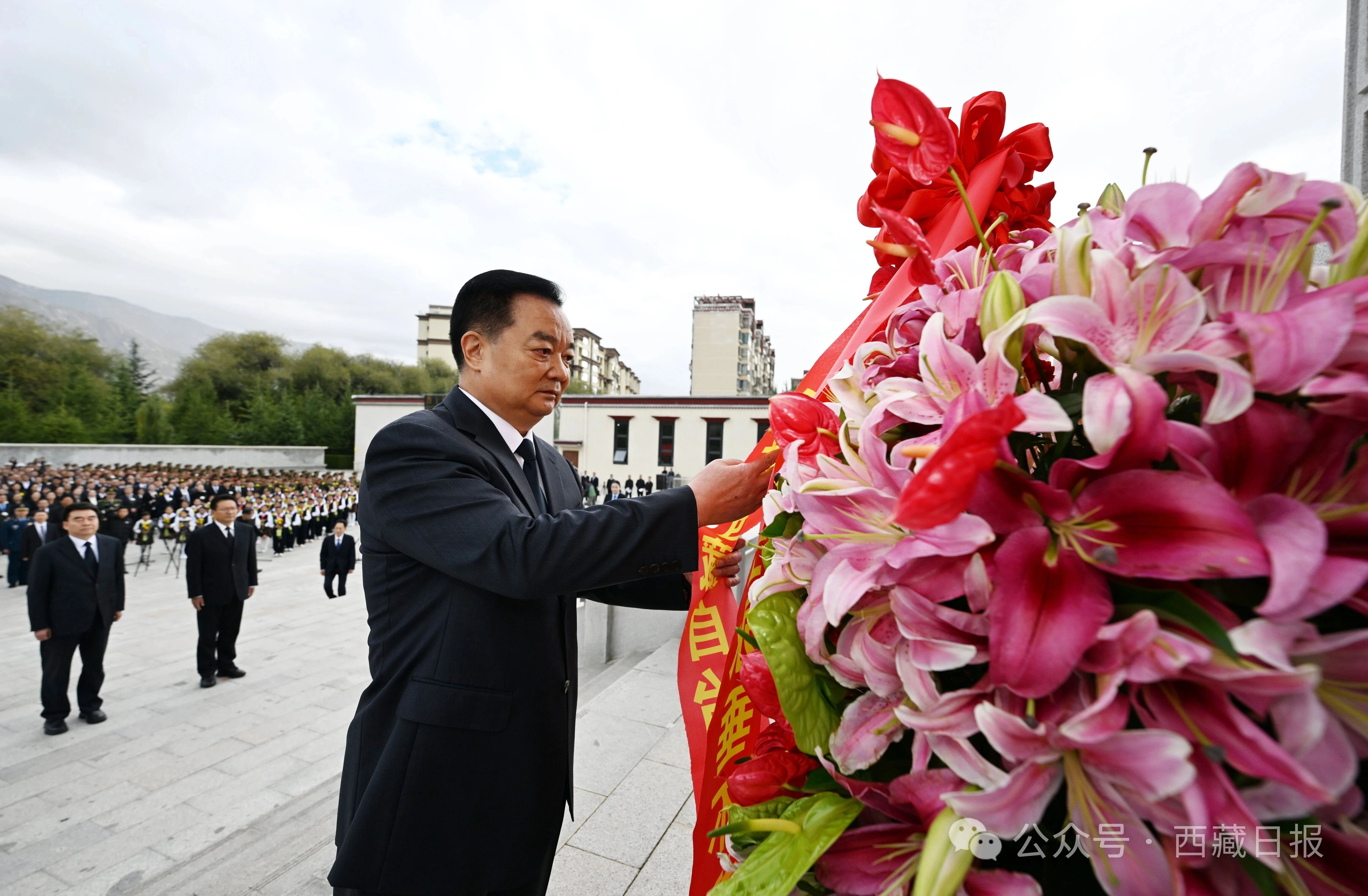 区(中)直单位和拉萨市干部职工代表,烈属、老战士和退役军人代表,学校师生、城镇居民和群众代表,解放军、武警部队官兵和公安干警代表等参加了敬献花篮仪式。