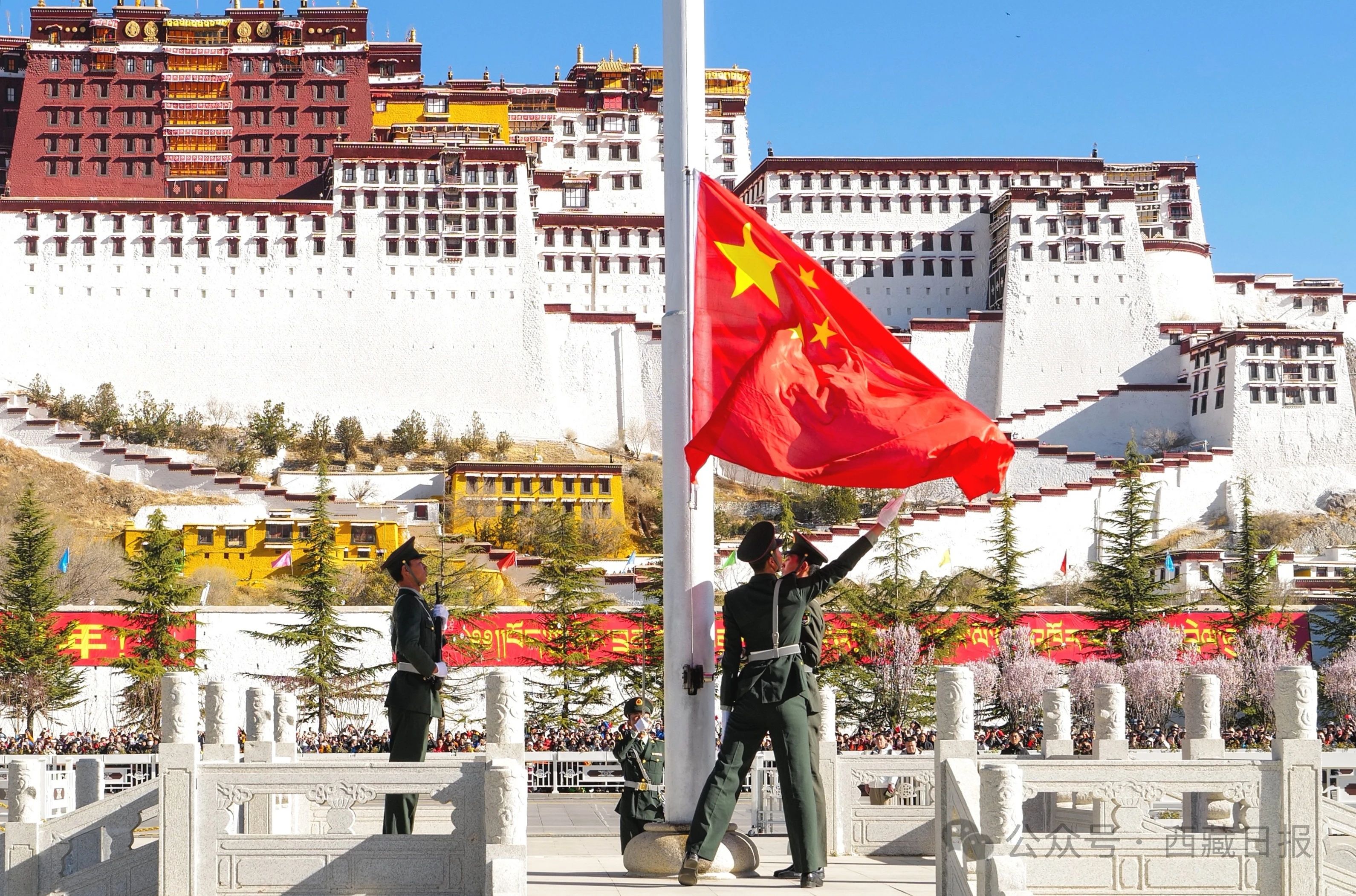 高原三月,春风送暖,草木新绿。布达拉宫广场上,用绢花制作摆放的“3·28西藏翻身农奴的节日”字样格外醒目,各族各界代表整齐肃立、神情庄重。10时整,“升国旗 唱国歌”仪式正式开始。一队英姿飒爽的礼兵迈着铿锵有力的步伐,庄严地护卫国旗走向升旗台。现场奏响雄壮的《义勇军进行曲》,大家齐声高唱国歌,升旗手迎风振臂,鲜艳夺目的五星红旗冉冉升起。